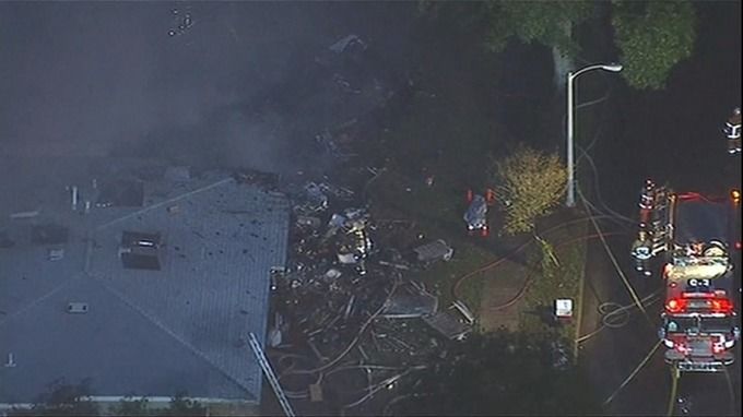 После аварии в двух частных домах, на которые рухнул самолет, вспыхнул пожар. Огонь распространился и на соседнее жилое здание. Тушение продолжается.