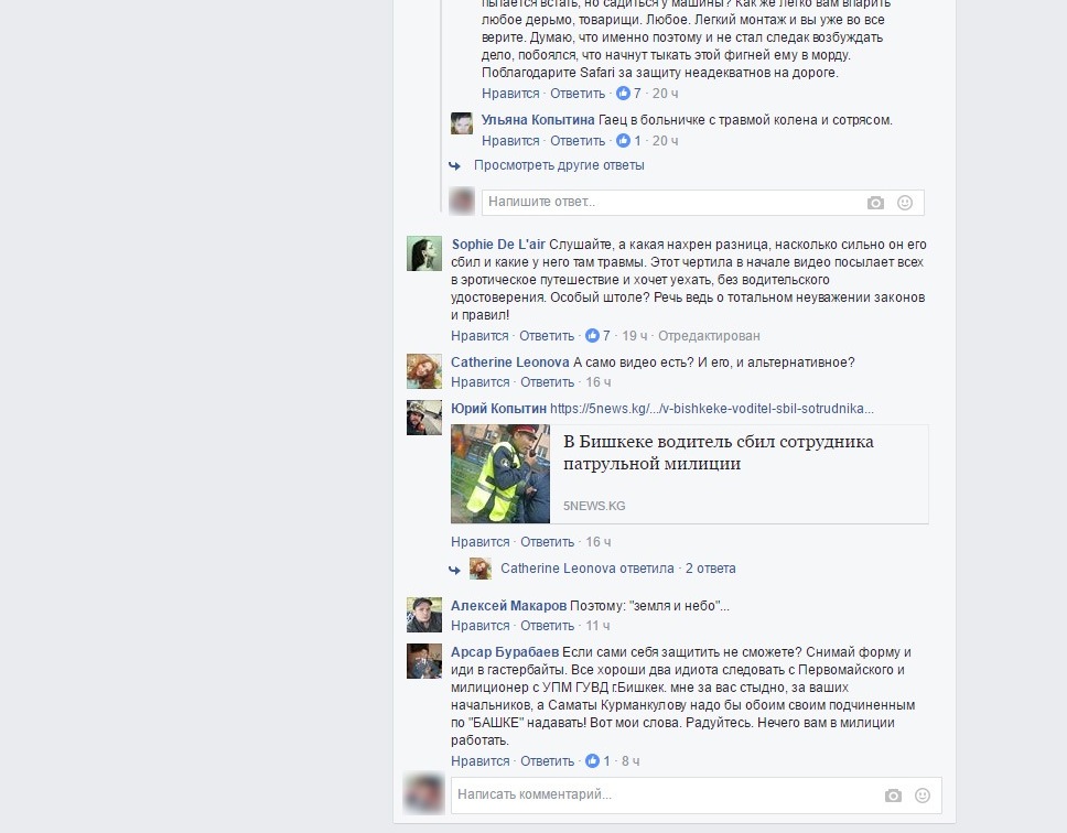 «Закон суров, но он закон. Некоторые представители закона трактуют закон в сторону своей личной прибыли. Вот результат, когда за человека, исполняющего свои обязанности, даже в соцсети, мягко говоря, мало кто вступился», — написал пользователь Facebook Таалайбек Закиров.