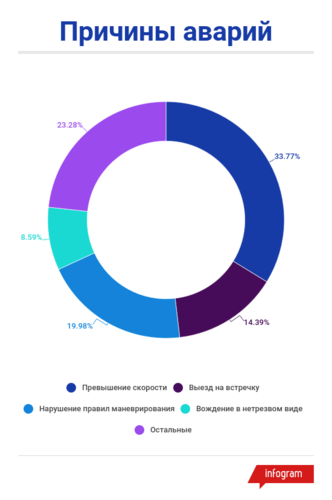 Львиную долю ДТП составляют наезды на пешеходов (42,9 процента) и столкновение автомобилей (33 процента). Кроме того, статистика показывает, что 21 процент аварий происходит по вине водителей со стажем менее трех лет.