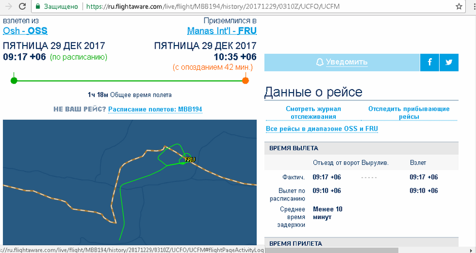 Данные о полете доступны на сайте ru.flightaware.com. Отмечается, что рейс из Оша вылетел по расписанию, но прибыл в Бишкек с опозданием на 42 минуты.