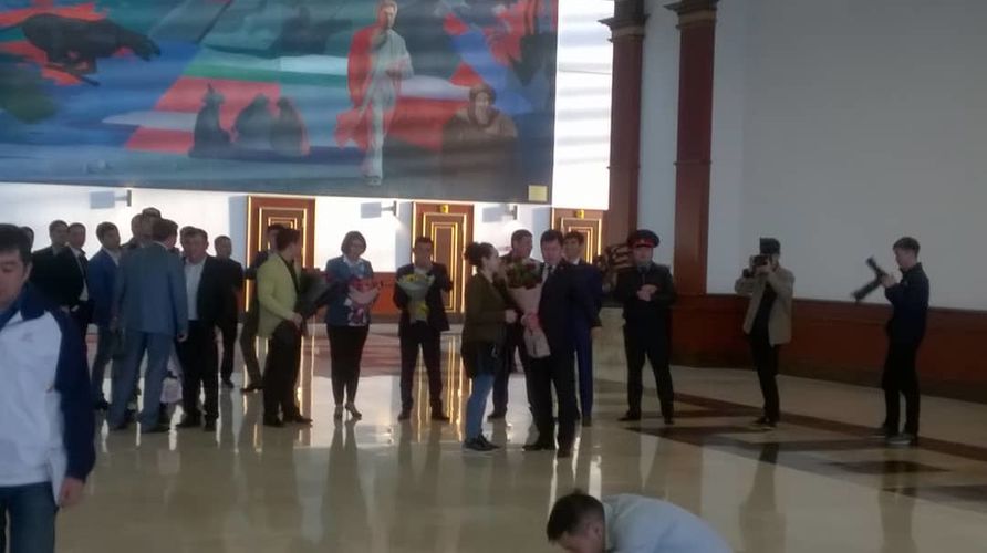 В аэропорту «Манас» ее встретили родные, болельщики, чиновники и журналисты.