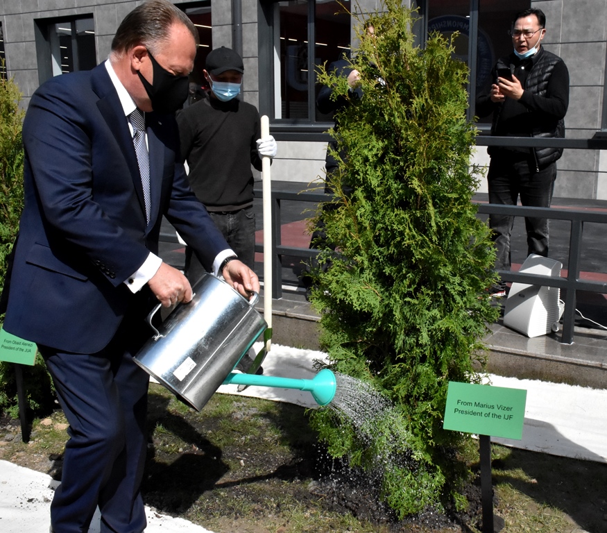 Почетные гости Мариус Визер, Обейд Аль Анзи и Жолдошбек Колбаев перерезали красную ленточку и посадили ели в честь открытия.
