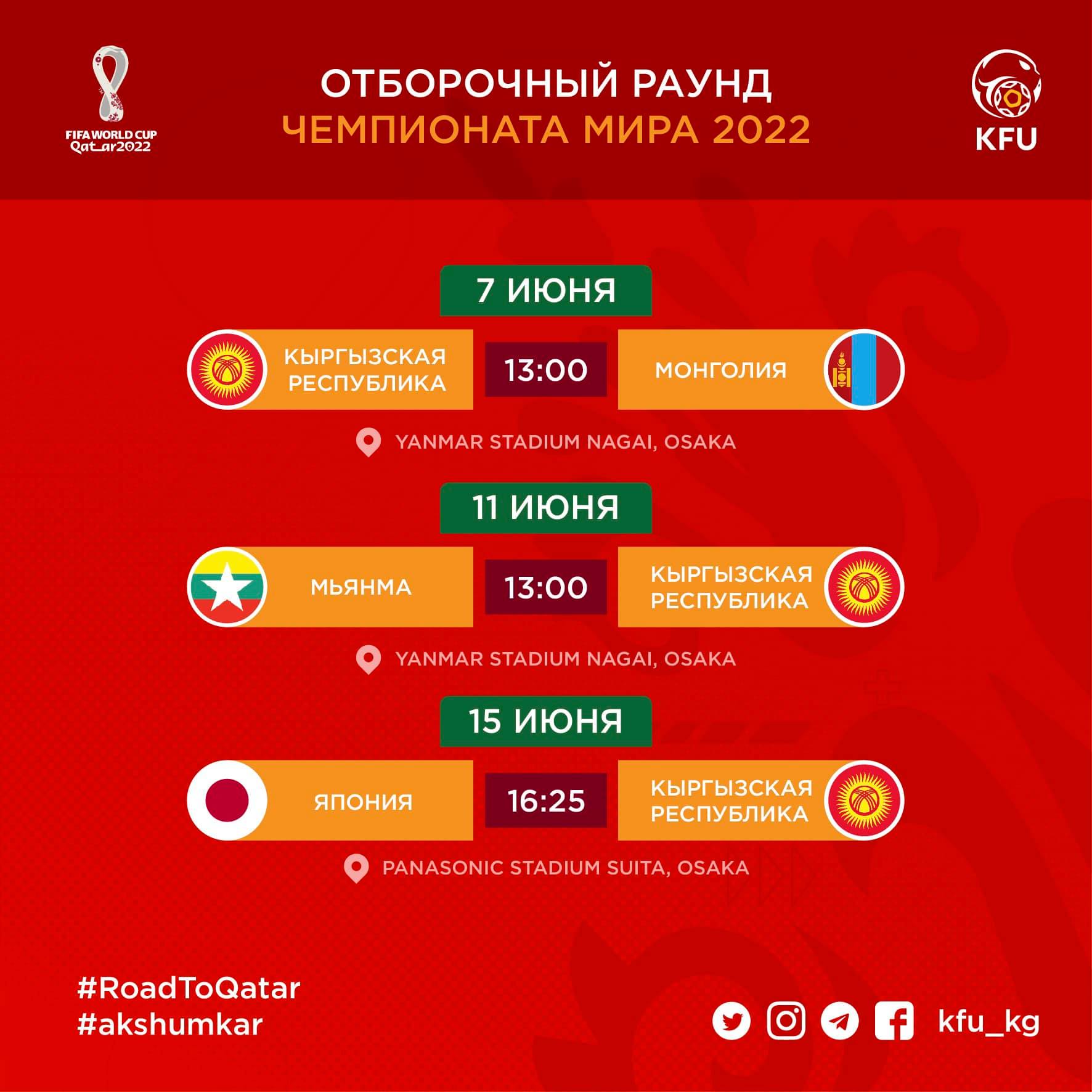 В июне в Осаке (Япония) сборная Кыргызстана сыграет три матча в рамках отборочного тура чемпионатов мира — 2022 и Азии-2023. Об этом сообщается в соцсетях Кыргызского футбольного союза.