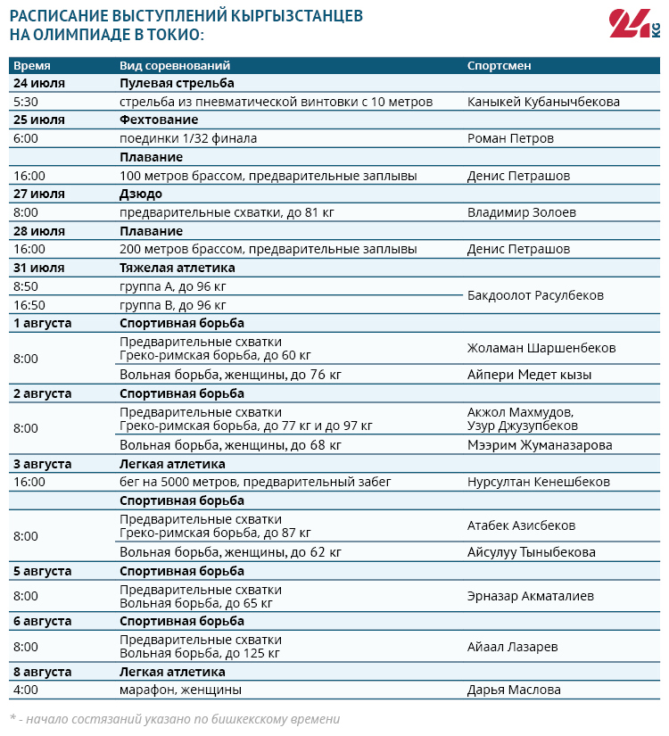24-kg.com представляет предварительное расписание соревнований с участием кыргызстанских спортсменов в рамках XXXII Олимпийских игр.