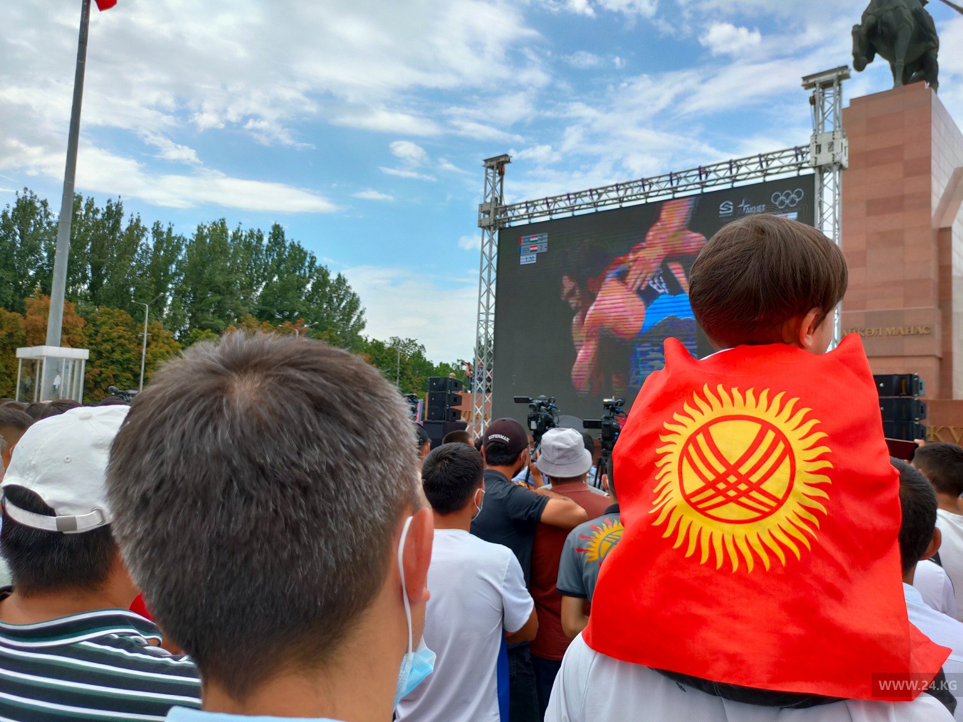 На площади собралось около 2 тысяч человек. Все они с замиранием сердца следят за поединками кыргызстанцев в Токио.