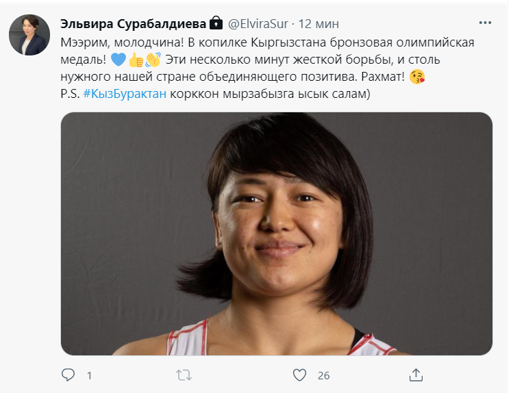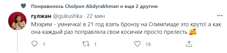 «Акжол молодец! Олимпийское золото у него впереди с таким-то характером! Мээрим молодчина! В копилке Кыргызстана бронзовая олимпийская медаль! Отлично! Эти несколько минут жесткой борьбы и столь нужного нашей стране объединяющего позитива. Рахмат! «Кыз-Бурактан» корккон мырзабызга ысык салам (Горячий привет господину, который боялся «Кыз-Бурака»)», — отметила она.