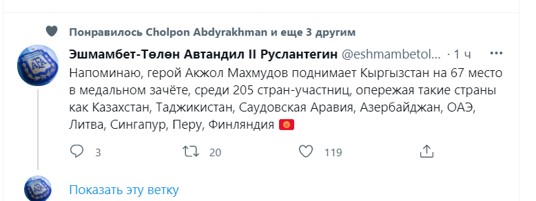 Пользователь Эшмамбет-Толон напомнил, что Акжол Махмудов своей победой поднимает Кыргызстан на 67-е место в медальном зачете среди 205 стран-участниц. «Так мы опережаем такие государства, как Казахстан, Таджикистан, Саудовскую Аравию, Азербайджан, ОАЭ, Литву, Сингапур, Перу, Финляндию», — подчеркнул он.