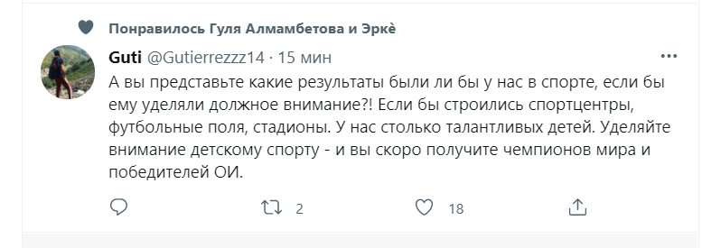 «А вы представьте, какие результаты были бы у нас в спорте, если бы ему уделяли должное внимание?! Если бы строились спортивные центры, футбольные поля, стадионы. У нас столько талантливых детей! Уделяйте внимание детскому спорту — и вы скоро получите чемпионов мира и победителей Олимпийских игр», — считает пользователь Gutierrezzz14 Twitter.