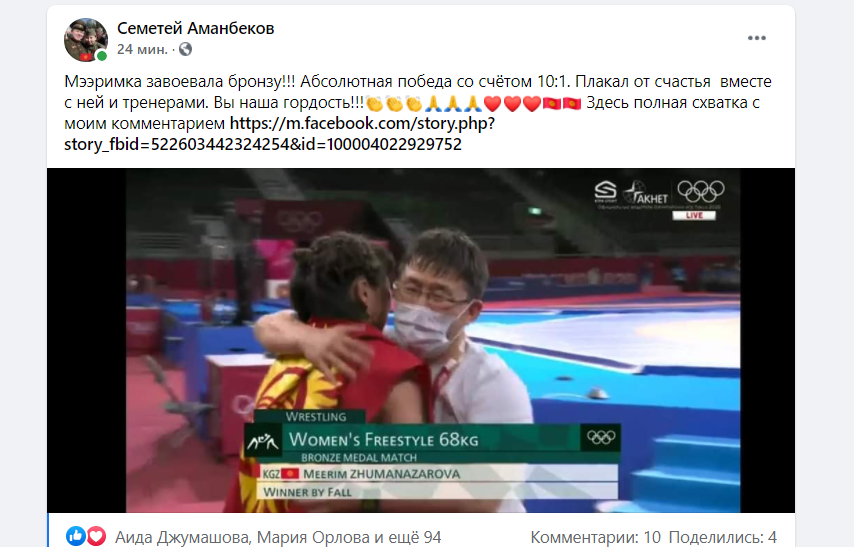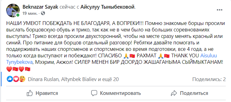 «Наши умеют побеждать не благодаря, а вопреки. Помню, знакомые борцы просили выслать борцовскую обувь и трико, так как не в чем было на больших соревнованиях выступать. Трико всегда просили двустороннее, чтобы на месте сразу менять, — красное или синее. Про питание для борцов отдельный разговор. Ребятки, давайте помогать и поддерживать наших спортсменов и спортсменок во время подготовки, все четыре года, а не только когда выступают и побеждают! Спасибо, Айсулуу, Акжол, Мээрим! Горжусь, что живу с вами в одном поколении», — написал он.