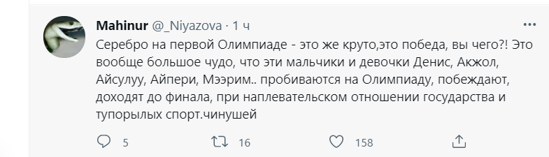 С таким мнением согласна и журналист Махинур Ниязова. «Серебро на первой Олимпиаде — это же круто, это победа, вы чего?! Это, вообще, большое чудо, что эти мальчики и девочки Денис, Акжол, Айсулуу, Айпери, Мээрим пробиваются на Олимпиаду, побеждают, доходят до финала при наплевательском отношении государства», — пишет она.