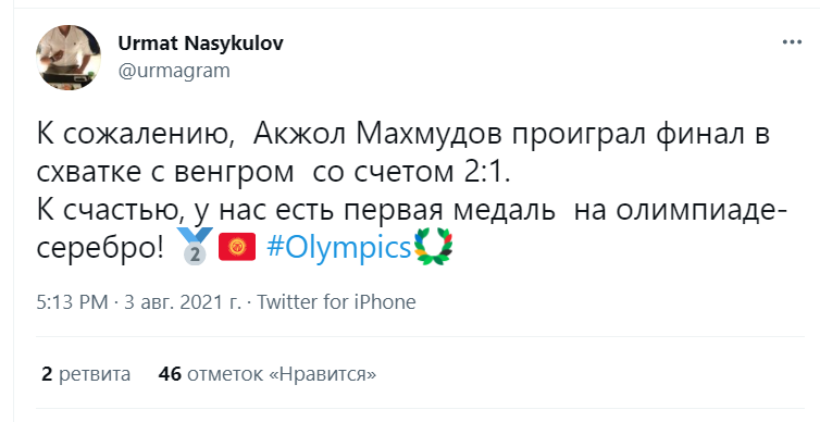 У других пользователей восторга было меньше. Экономический эксперт Азамат Акенеев, комментируя выступление спортсменов, написал: «Серебро проигрывают, бронзу выигрывают».Другой кыргызстанец Урмат Насыкулов принял проигрыш Акжола Махмудова с сожалением. «К сожалению, Акжол Махмудов проиграл финал в схватке с венгром со счетом 2:1. К счастью, у нас есть первая медаль на Олимпиаде — серебро! Медаль за второе место», — написал он.