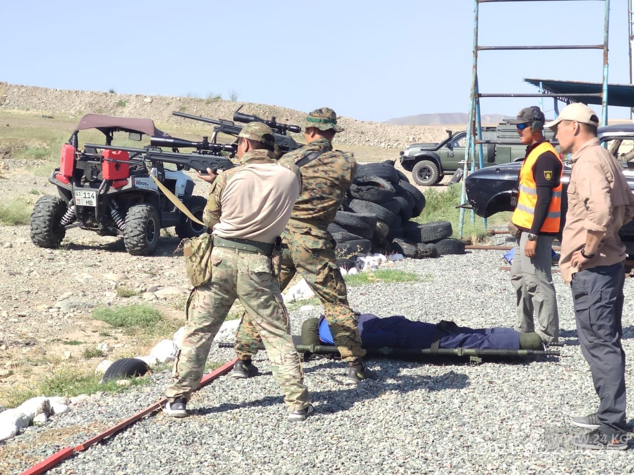 «Помимо общевойсковых и полицейских упражнений, стрелки отрабатывали эвакуацию раненых и упражнение «сломанный прицел», по условиям которого судья сбивал настройки оптического прицела, заклевывает скотчем ручки регулировки, а стрелку приходится стрелять практически вслепую», — рассказал 24-kg.com руководитель турнира Эркин Усубалиев.