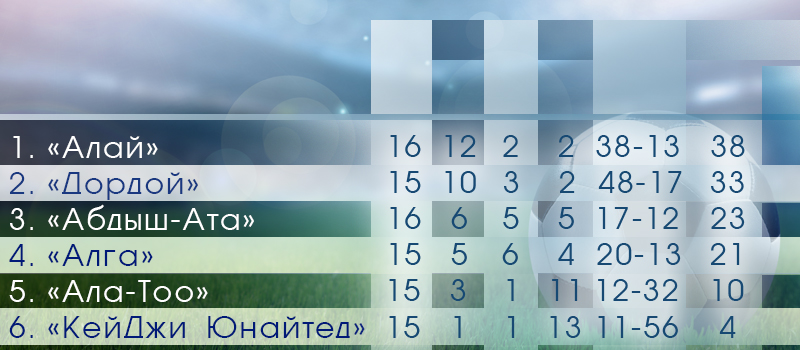 Как сообщается, в настоящее время в турнирной таблице лидирует «Алай» (38 очков). Далее следуют «Дордой» (33 очка) и «Абдыш-Ата» (23 очка). Среди бомбардиров на первом месте идет Мирлан Мурзаев («Дордой») – 15 голов.