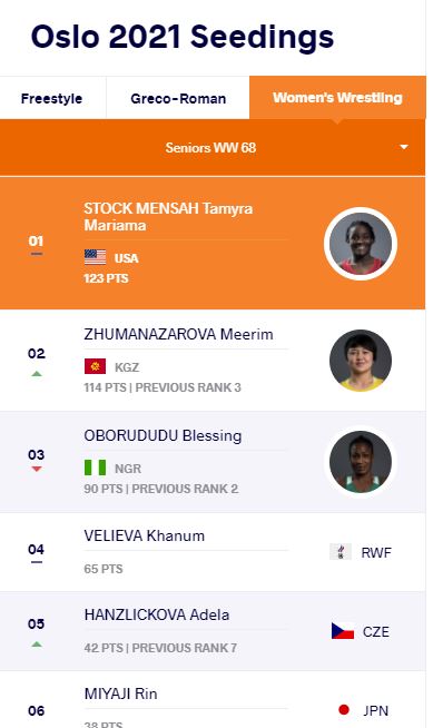 По его данным, обновленный рейтинг составили по итогам чемпионата мира, который прошел в Осло (Норвегия). Отмечается, что на первом месте в списке до 68 килограммов находится спортсменка из США Тамира Сток Менса — 123 очка, на втором Мээрим Жуманазарова — 114 очков, на третьем Блэссинг Оборудуду из Нигерии — 90 очков.