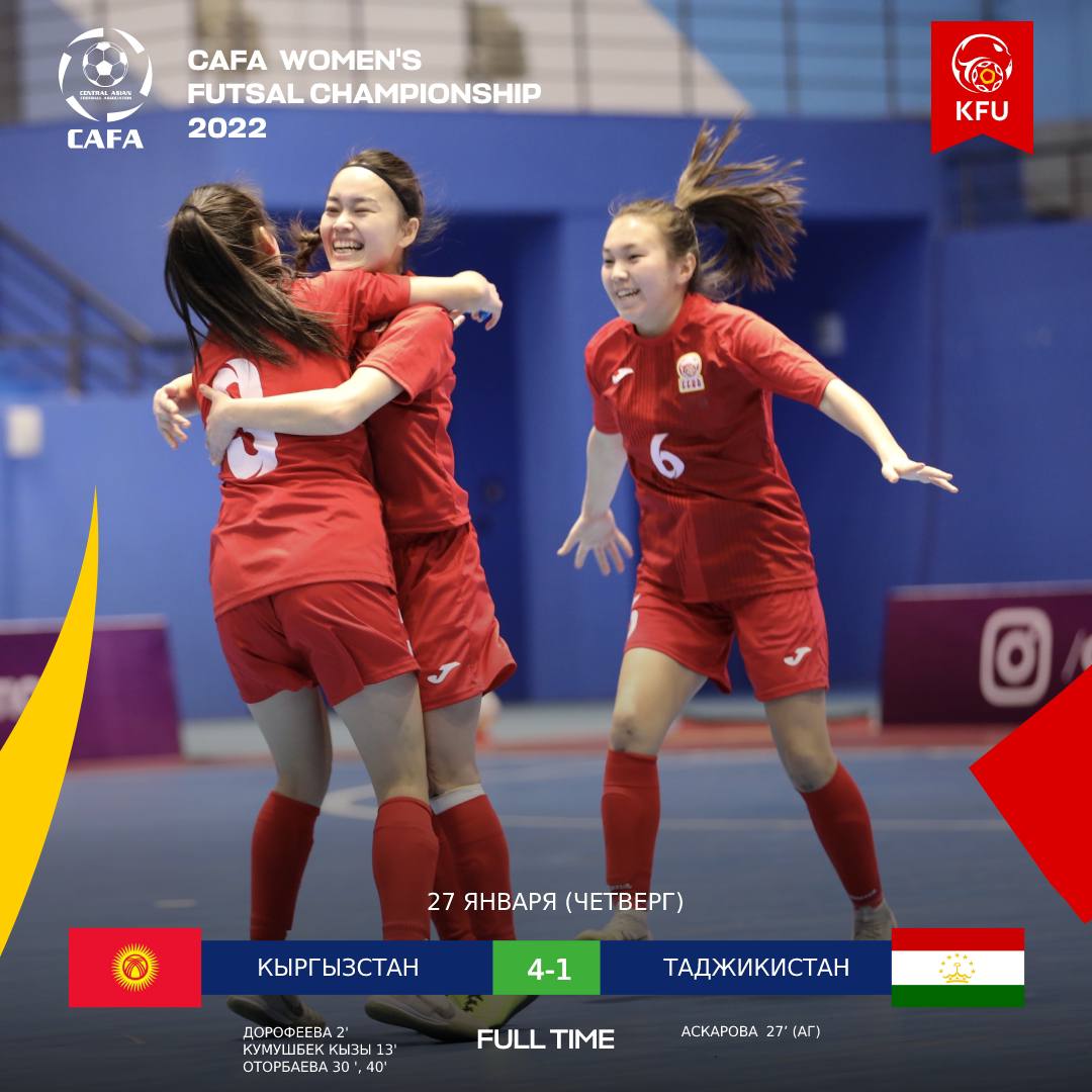 Вторая встреча сборной Кыргызстана и Таджикистана по футзалу в рамках международного турнира CAFA Women’s Futsal Championship завершилась победой отечественных футболисток со счетом 4:1. Матч состоялся накануне вечером в Душанбе.