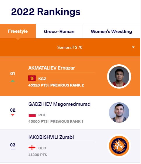 Кыргызстанский борец вольного стиля в весовой категории до 70 килограммов Эрназар Акматалиев поднялся на первое место. В предыдущем рейтинге он занимал вторую строчку.