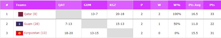 Накануне в Сингапуре она провела две игры и обе проиграла. Счет матча с Гуамом — 13:15, с Катаром — 18:20.