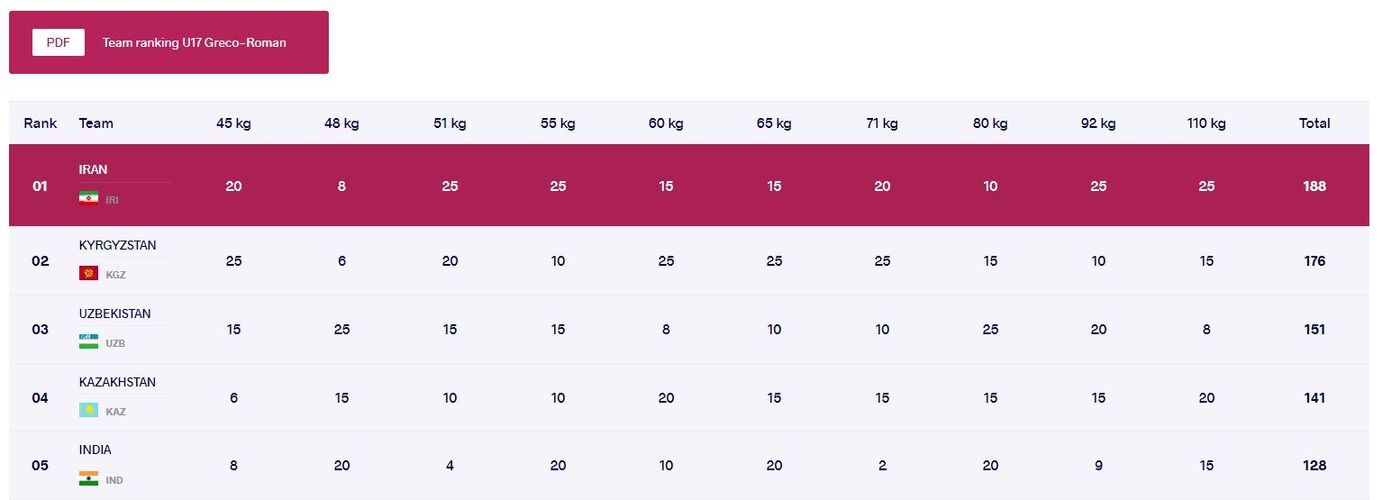 Кыргызстанцы завоевали четыре золотые, одну серебряную и две бронзовые награды, заняв второе общекомандное место. Первыми стали спортсмены из Ирана. Замкнули тройку борцы из Узбекистана.
