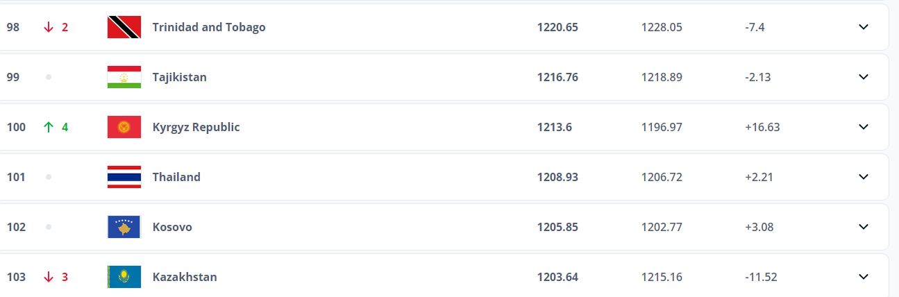 Сборная Кыргызстана по футболу оказалась на 100-м месте в рейтинге ФИФА. Обновленный список опубликован на сайте международной федерации.