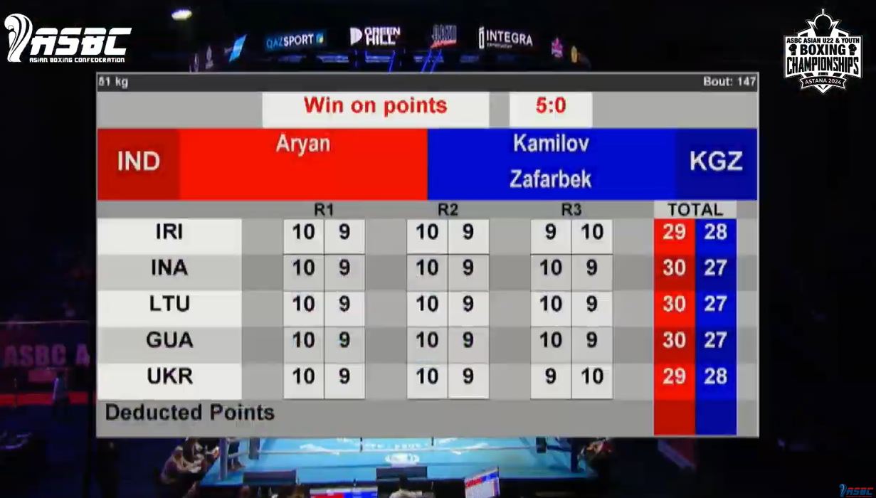 В весовой категории до 51 килограмма Зафарбек Камилов встретился с представителем Индии. Судьи отдали победу сопернику кыргызстанца — 5:0.