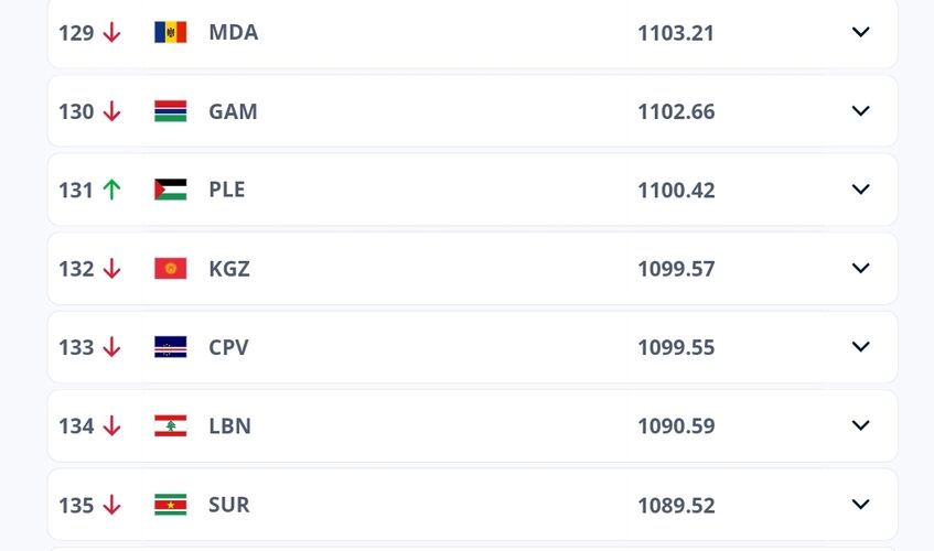 В рейтинге 193 сборные. В тройке лидеров — Испания, Франция, Англия.