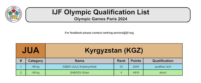 Кубанычбек Айбек уулу занял 33-е место в весовой категории до 66 килограммов. Однако пять спортсменов получили континентальные квоты, среди них и кыргызстанец.