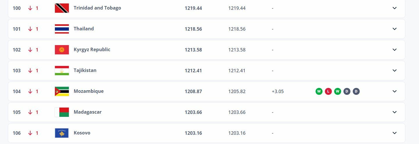 Сборная Кыргызстана по футболу оказалась на 102-м месте в рейтинге ФИФА. Обновленный список опубликован на сайте международной федерации.