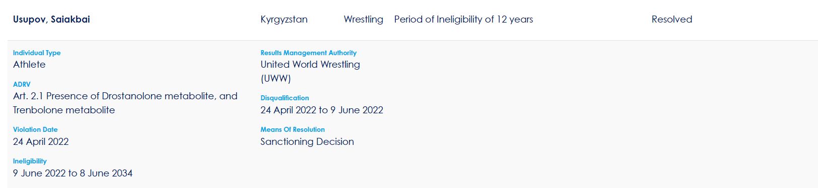 Кыргызстанский борец вольного стиля Саякбай Усупов дисквалифицирован на 12 лет за допинг. Об этом сообщается на сайте Международного агентства по тестированию.