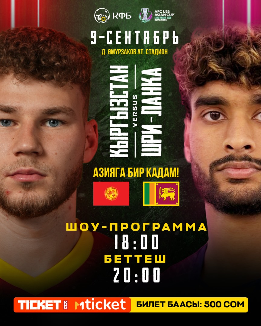 «9 сентября олимпийскую сборную Кыргызстана ждет решающая игра против Шри-Ланки. Матч состоится в 20.00 на стадионе имени Долона Омурзакова в Бишкеке. Перед игрой для болельщиков подготовлена большая шоу-программа, которая начнется в 18.00», — говорится в сообщении.