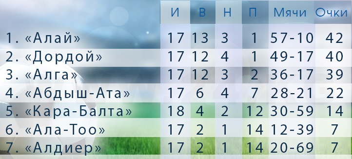 Как сообщается, на счету «Алая» стало 42 очка, он по-прежнему лидирует в турнирной таблице. «Дордой», отставая на два очка, обогнал «Алгу» и вышел на второе место. До конца чемпионата почти всем командам осталось провести по одной игре. «Кара-Балта» выступление уже завершила.
