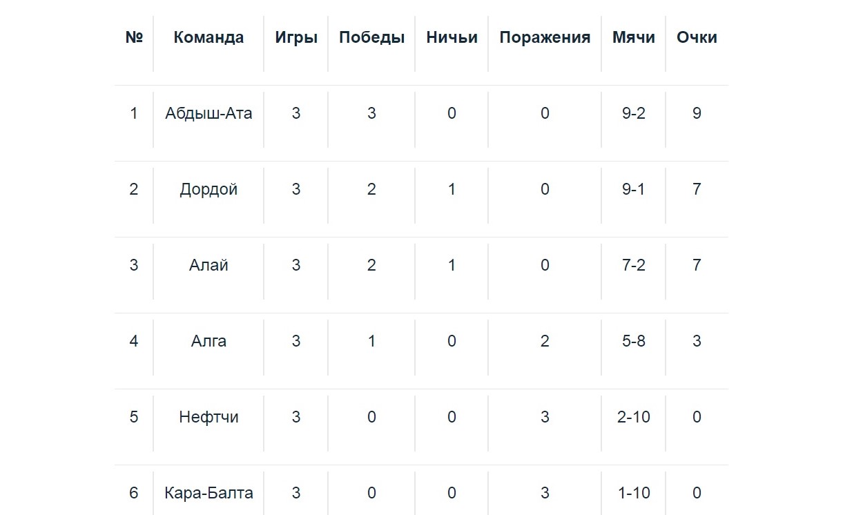 Кроме того, кантская «Абдыш-Ата» на своем поле победила «Кара-Балту» — 3:0. Голы забили Иван Филатов, Нуркал Сатаев и Бахтияр Дуйшобеков. «Абдыш-Ата» (9 очков) возглавляет турнирную таблицу. «Дордой» и «Алай» (по 7 очков) идут следом. На четвертом месте «Алга» (3 очка). У «Нефтчи» и «Кара-Балты» очков пока нет.
