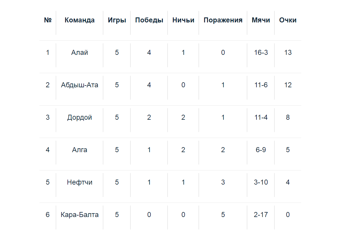 По итогам пяти туров «Алай» (13 очков) лидирует в турнирной таблице. Следом идут «Абдыш-Ата» (12) и «Дордой» (8). Второй круг стартует уже 13 мая.