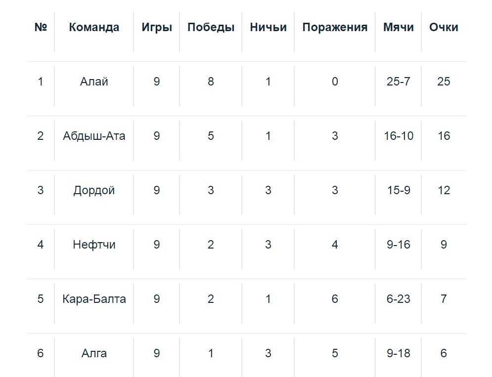 По данным Футбольной лиги КР, накануне завершился девятый тур национального первенства. Столичные «Алга» и «Дордой» победителя не выявили — 0:0. Ничейный результат зафиксирован и в игре «Кара-Балта» — «Нефтчи» (Кочкор-Ата) — 2:2. У «Кара-Балты» забили Атай Джакыпбаев и Назар Исаков, у «Нефтчи» дубль оформил Алишер Тухтасинов. В центральном поединке тура «Алай» в гостях победил кантскую «Абдыш-Ату» — 1:0. Отличился Алиа Силла.