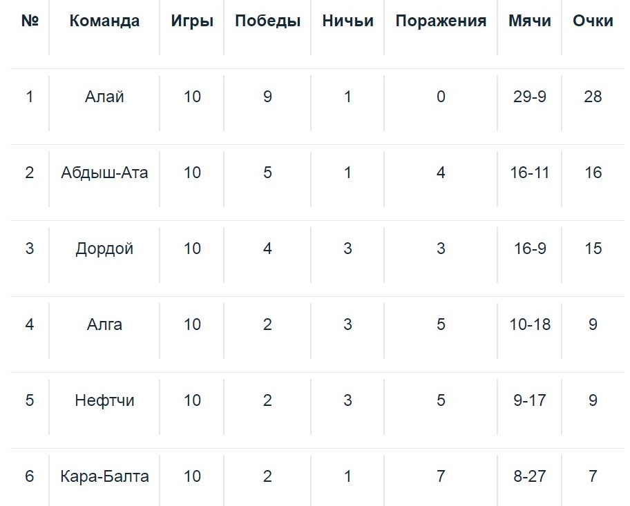 По ее данным, в рамках национального первенства состоялось два матча десятого тура. «Алай» дома со счетом 4:2 переиграл «Кара-Балту». У победителей два гола на счету Модибо Сидибе, по разу отличились Ильяз Алимов и Акрам Умаров. У гостей голы забили Атай Джакыпбаев и Саламат Мамбеталиев.