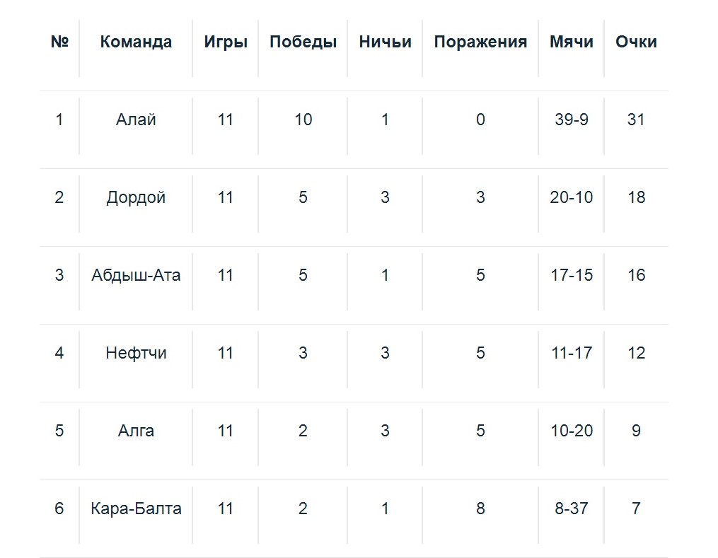 В турнирной таблице уверенно лидирует «Алай» (31 очко). На второе место вышел «Дордой» (18), третьей идет «Абдыш-Ата» (16). Следующий тур намечен на 5-6 августа.