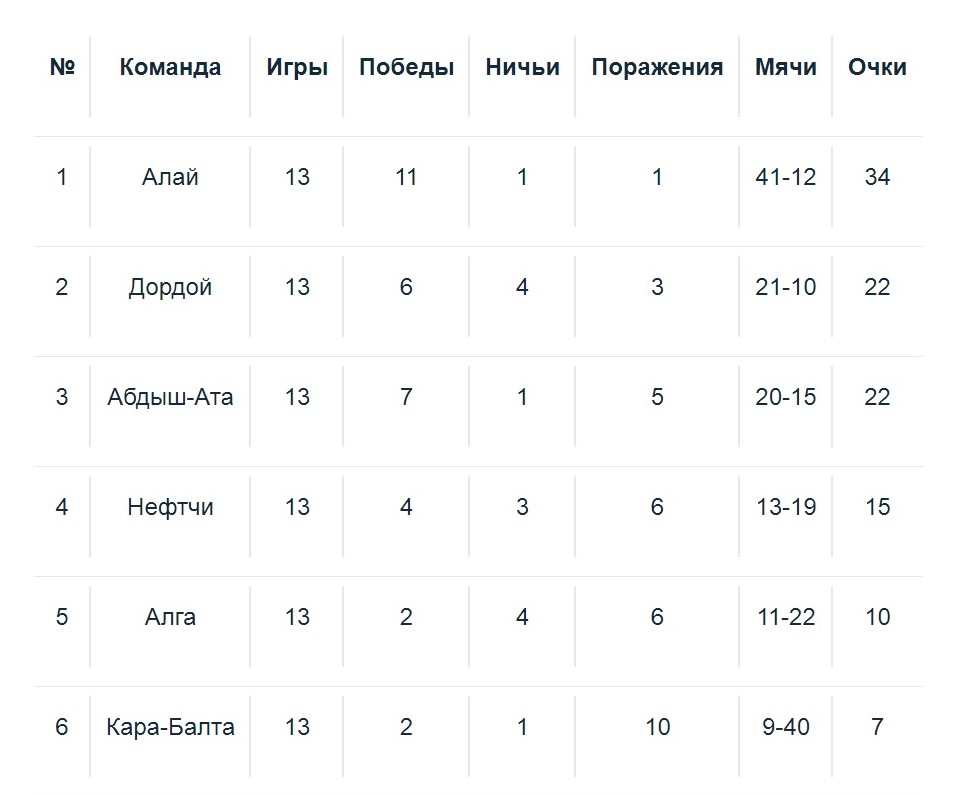 По ее данным, накануне завершился 13-й тур национального первенства. Ошский «Алай» дома обыграл столичную «Алгу» - 2:1. У ошан мячи забили Акрам Умаров и Владимир Веревкин, у бишкекчан – Ильдар Амиров.