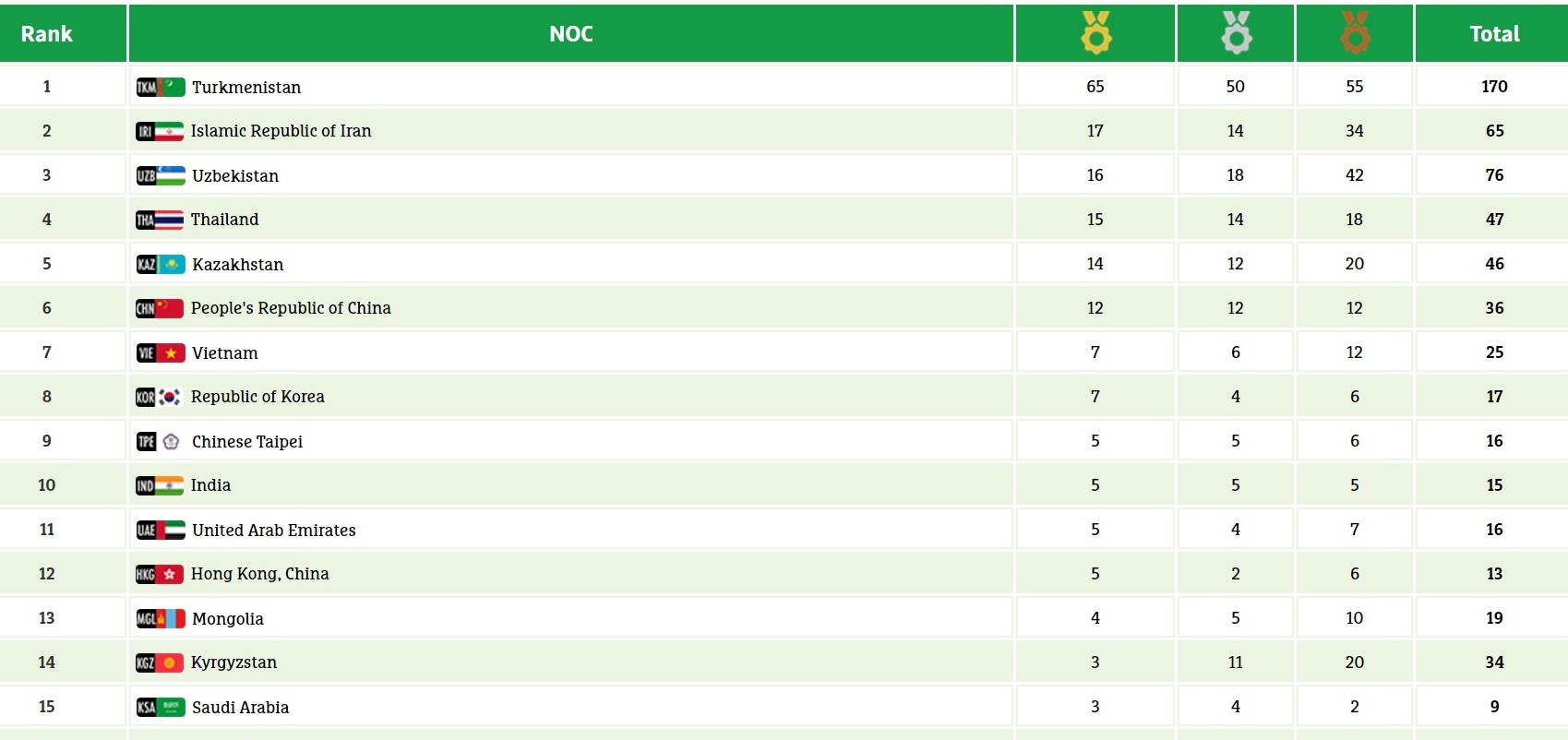 По итогам первой недели игр на счету сборной КР три золотые, 11 серебряных и 20 бронзовых наград. В медальном зачете она на 14-м месте. Азиада завершится 27 сентября.