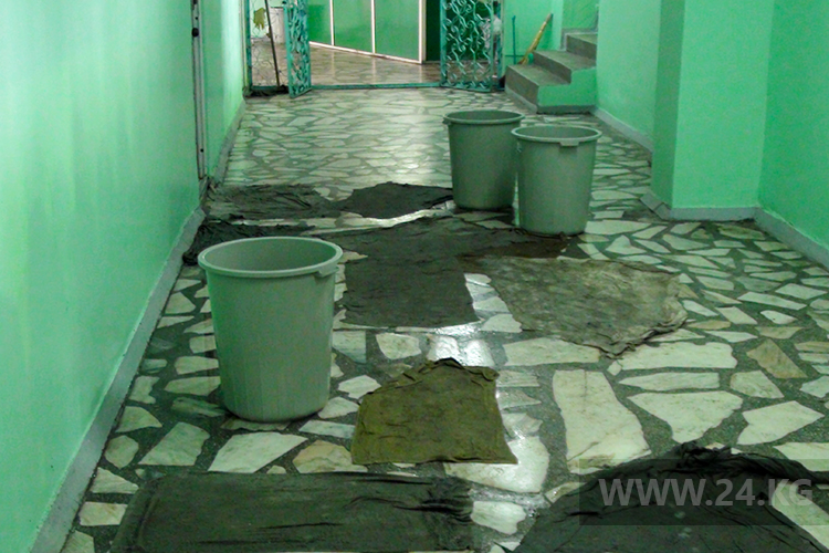 Часть воды попадает в специально выставленные по такому случаю емкости, часть — на пол. Кое-где образовались лужи.