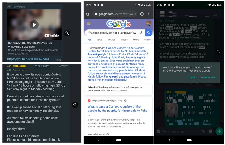 Функция предварительной проверки на фейковые новости появилась в последней бета-версии приложения под Android. Когда пользователь собирается переслать полученное сообщение, в интерфейсе появляется значок поиска. При нажатии на «лупу» контент проверяется поиском Google в интернете.