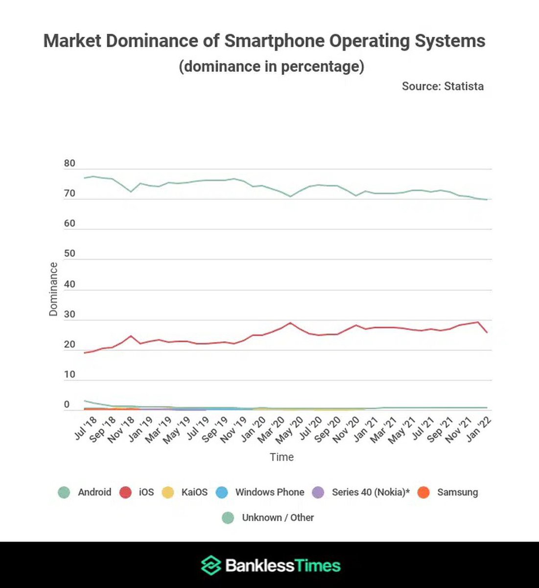 По информации StockApps, в июле 2018 года Android доминировала на мировом рынке мобильных ОС с долей 77,32 процента, однако к январю 2022-го этот показатель сократился до 69,74 процента. За это же время мировая доля iOS выросла с 19,4 до 25,49 процента, то есть получила дополнительные 6 процентных пунктов.