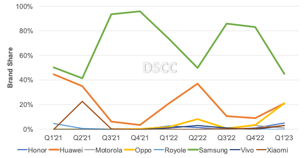 Смартфон Samsung оказался самым популярным складным смартфоном на рынке в первом квартале 2023 года. Об этом аналитик Display Supply Chain Consultants (DSCC) Росс Янг сообщил в своем Twitter.