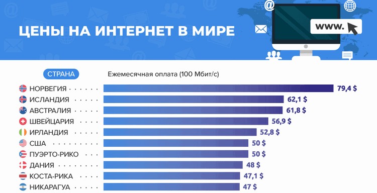 Самым дорогим признан домашний интернет в Норвегии. Обычный норвежец платит $79,4 в месяц (около 7 тысяч сомов). Также не повезло жителям Исландии ($62,1), Австралии ($61,8), Швейцарии ($56,9) и Ирландии ($52,8).