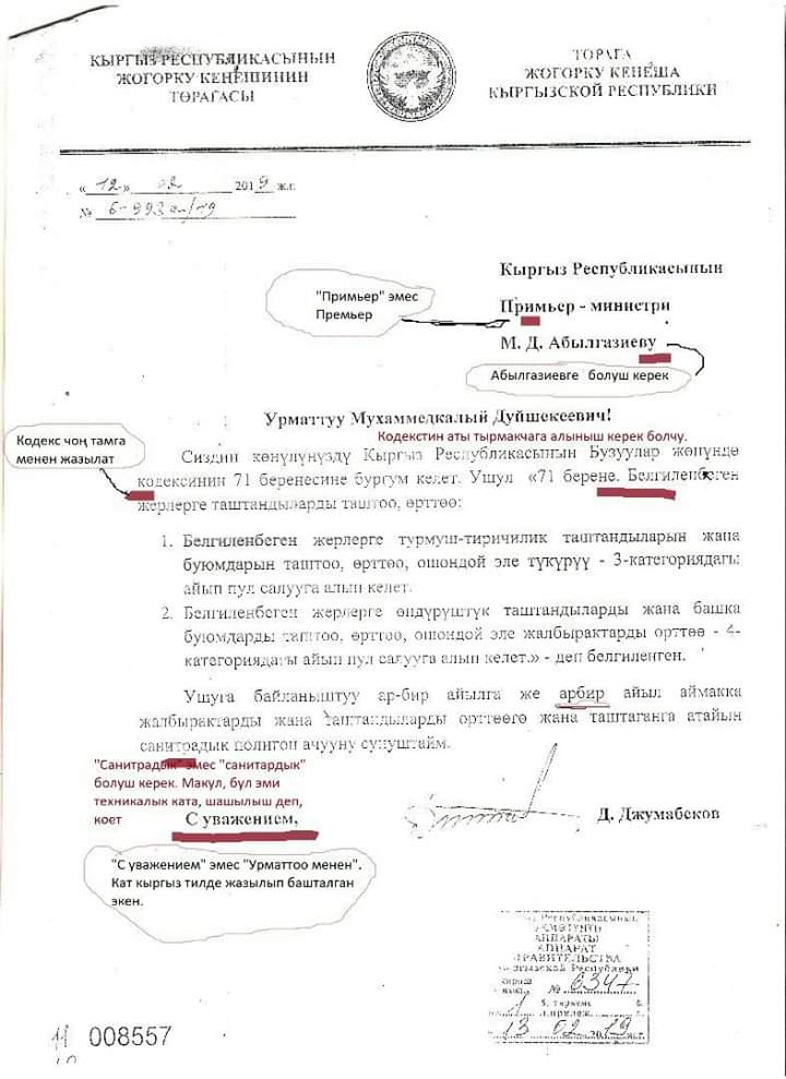 По их информации, в аппарате Жогорку Кенеша проведена проверка в связи с распространенным в социальных сетях документом (№ 6-993/19). «К сожалению, необходимо признать, что в данном письме допущены грубые ошибки», — признает парламент.