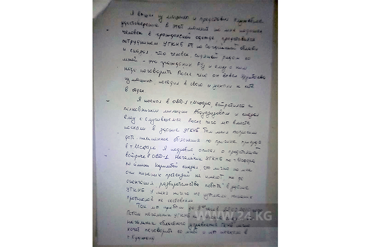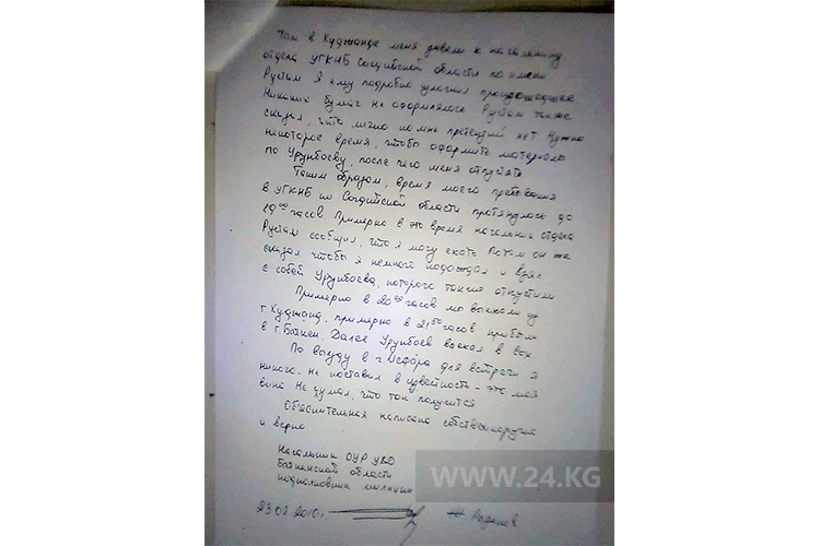 Параллельно с упреками нардепов и озвученными ими же подозрениями о причастности Жениша Разакова к таджикским спецслужбам в Сети появилась его объяснительная, датированная 23 февраля 2010 года. В то время, напомним, он был начальником отдела уголовного розыска УВД Баткенской области.