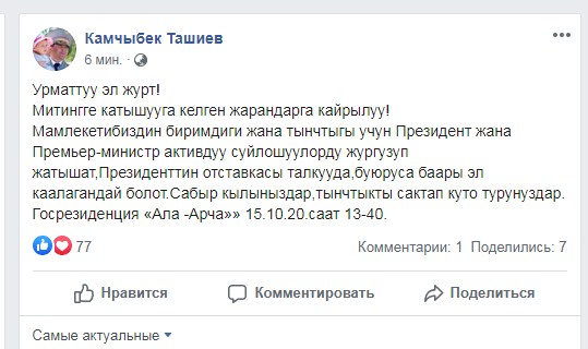 «Ради единства и спокойствия народа в настоящий момент премьер-министр и президент ведут переговоры. Обсуждается отставка президента. Даст бог, все будет так, как хочет народ. Сохраняйте спокойствие», — обратился к митингующим Камчыбек Ташиев.