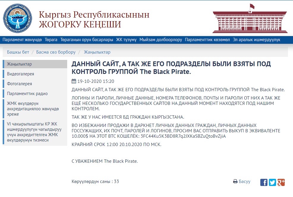 Взломан сайт Жогорку Кенеша. На главной странице парламентского интернет-ресурса указывается, что сайт, а также его подразделы были взяты под контроль группой the black pirate.
