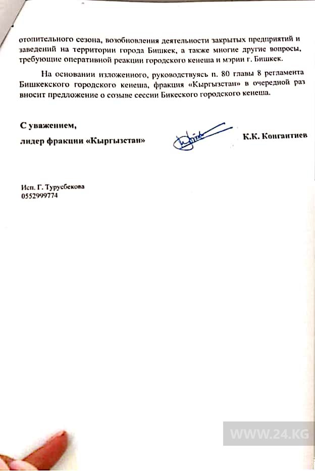 Фракция «Кыргызстан» вновь требует проведения внеочередной сессии Бишкекского городского кенеша. Об этом 24-kg.com сообщил ее лидер Куванычбек Конгантиев.