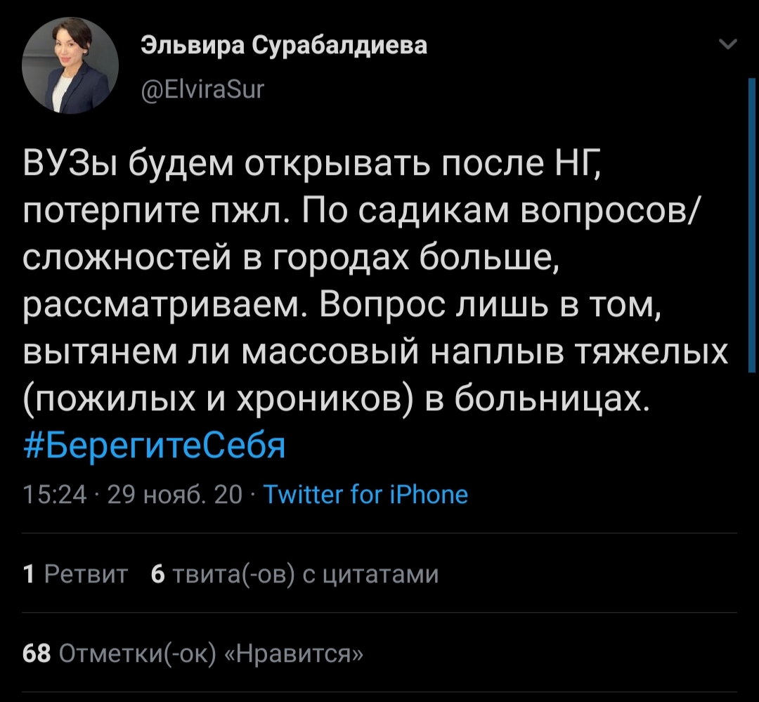 Чиновница просит кыргызстанцев потерпеть. «По детским садикам вопросов и сложностей в городах больше, рассматриваем их. Сейчас вопрос лишь в том, вытянем ли массовый наплыв тяжелых (зараженных коронавирусом) пожилых и хроников в больницах», — написала она.