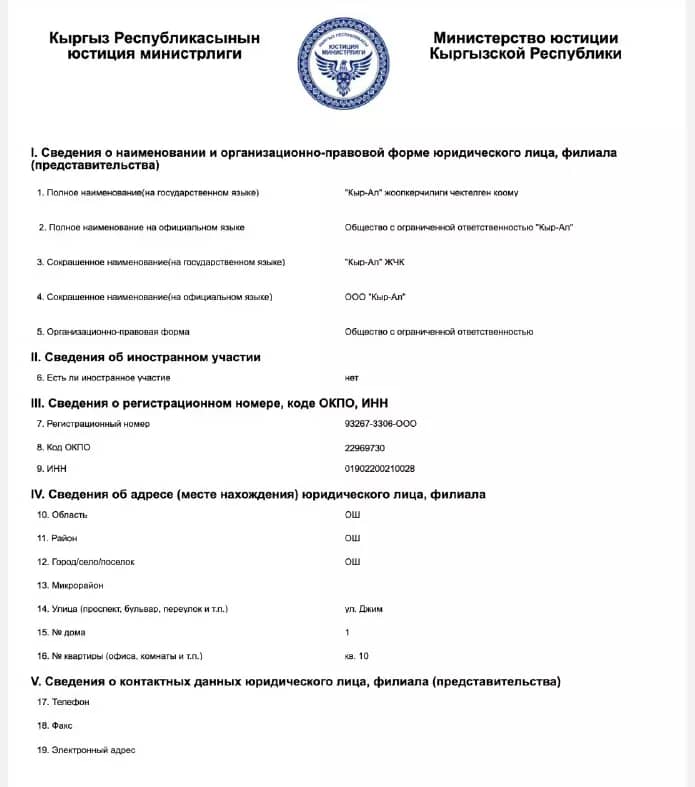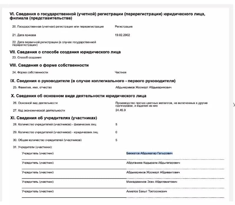 Уточняется, что зампред Центризбиркома является соучредителем ОсОО «Кыр-Ал». В базе данных Министерства юстиции указано, что компания занимается производством прочих цветных металлов, не включенных в другие группировки, и изделий из них. Основана в феврале 2002-го и все еще считается действующей, так как не проходила процедуру прекращения деятельности. Согласно регистрационным документам, ОсОО располагается в Оше. Сведений о налогах, перечисленных в бюджет, в базе данных «Открытый бюджет» нет.