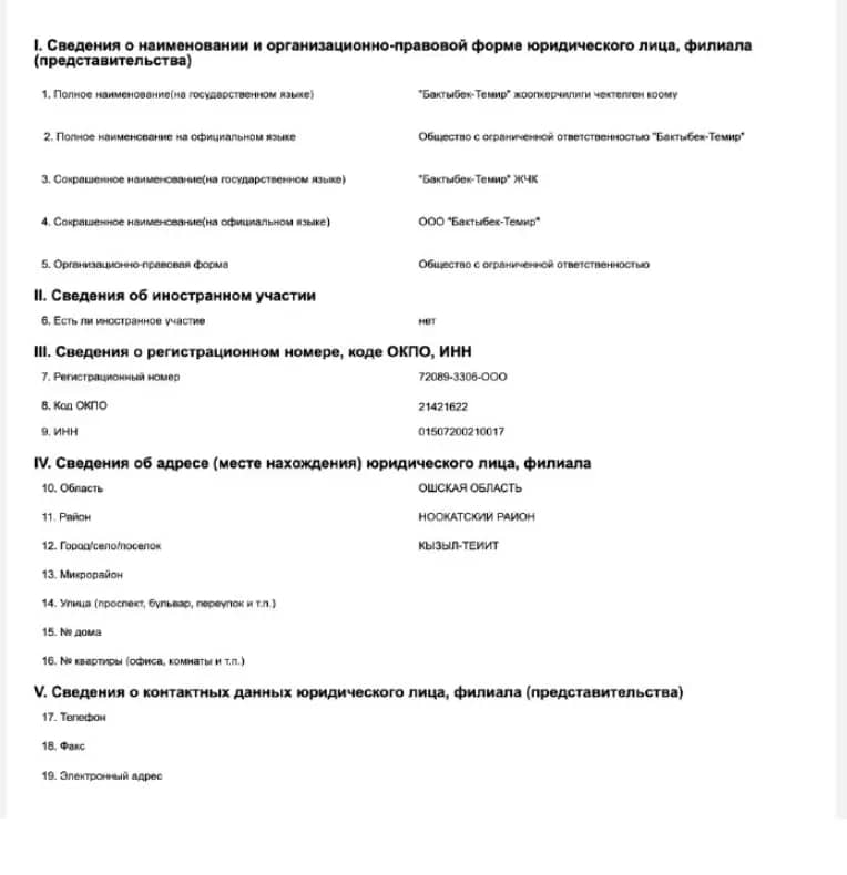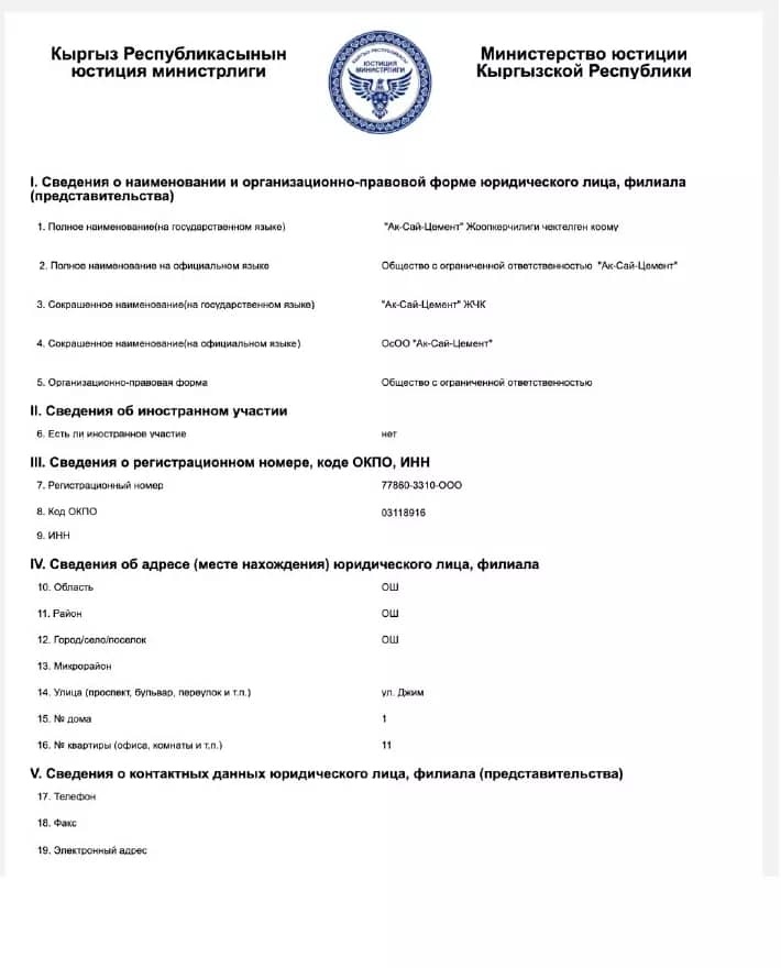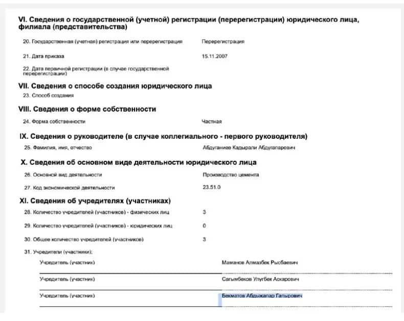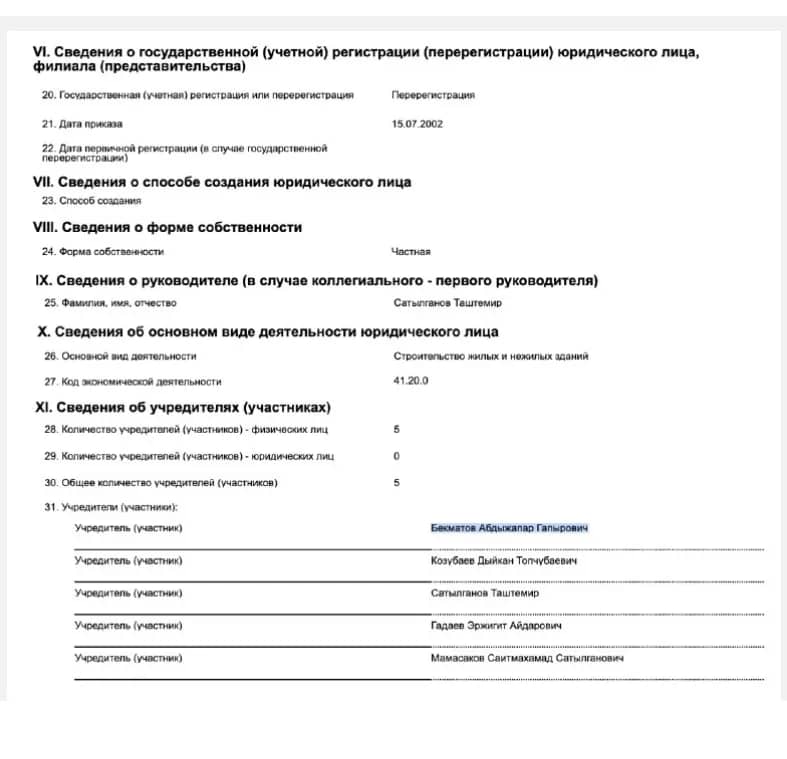 Еще одно ОсОО «Ак-Сай-Цемент», как становится понятно из названия фирмы, занимается производством цемента и зарегистрировано также в южной столице. Из-за отсутствия ИНН в регистрационных документах фирмы точная дата ее регистрации неизвестна, как и о налоговых отчислениях. Указано только, что в ноябре 2007 года она прошла перерегистрацию. У компании трое учредителей. ОсОО «Бактыбек-Темир» занимается строительством жилых и нежилых зданий, зарегистрировано в июле 2002-го. Фирма расположена в Ноокатском районе Ошской области. Ее учредили пятеро граждан Кыргызстана, информация о налогах отсутствует. Кроме Абдыжапара Бекматова, там учредителями числятся еще четыре человека. В декларациях зампредседателя ЦИК с 2015 по 2018 год эти компании не указаны.